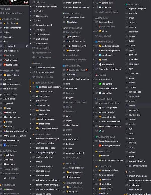 隨著發展,BanklessDAO具備了寫作、財務、翻譯、研究、運營、市場、法律、教育、設計、商務、開發、視頻、數據分析在內的13個子工會,Discord設立了200多個頻道,吸引了超過27000名用戶。