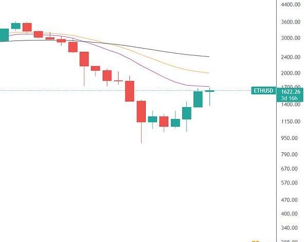 ETH回踩5周均線后強勢回升,同樣再次貼近上方壓力線1690-1700,關注能否站上。
