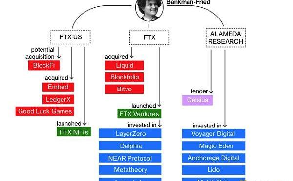 《彭博社》概略整理了目前?SBF手中三間主要公司旗下的收購/融資對象,這三間主要公司分別為?FTX、FTXUS、Alameda量化交易。