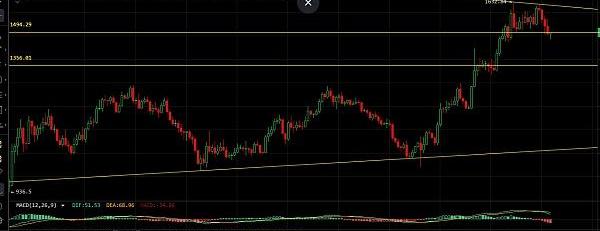 昨天以太坊大幅波動,從凌晨的1607附近開始回踩最低跌至1550附近反彈,晚間最高漲至1645附近震蕩一段時間后開始回踩,今天凌晨再次回踩1515附近支撐位反彈,現行情位于1540附近運行.
