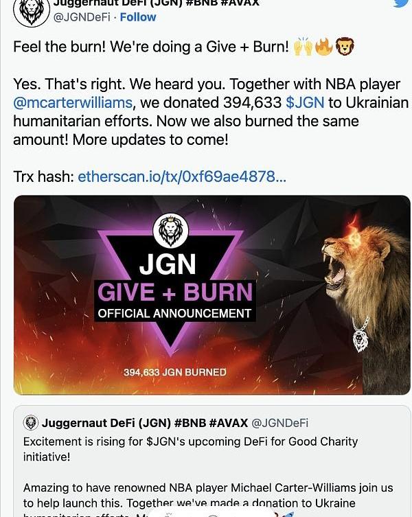 此外,為了與SteveAoki一起表達對這個時刻的敬意,JGN進行了Give+Burn,燃燒與捐贈了相同數量的JGN代幣!