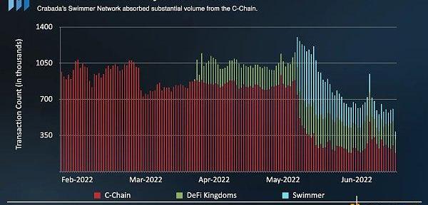 Crabada是一款以螃蟹為主題的P2E游戲,僅在Avalanche的C鏈上推出。在三個月內,它很快就占到了C鏈每日交易量的30%以上。這給整個C鏈的用戶帶來了更高的費用和延遲。巧合的是,對于Crabada社區和所有C鏈用戶來說,子網現在已經可以使用了。5月初,Crabada橋接到了自己的EVM兼容的子網,即Swimmer?Network。