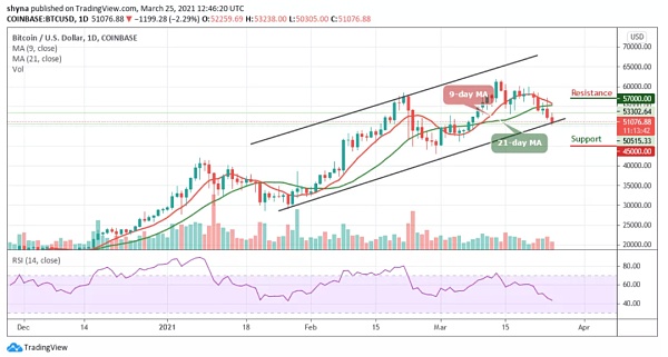 在4小時圖上,比特幣價格保持在9日和21日移動均線下方,即時支撐位在51,000美元的移動平均線下方。如果空頭完全重返市場,價格可能跌破50,000美元。