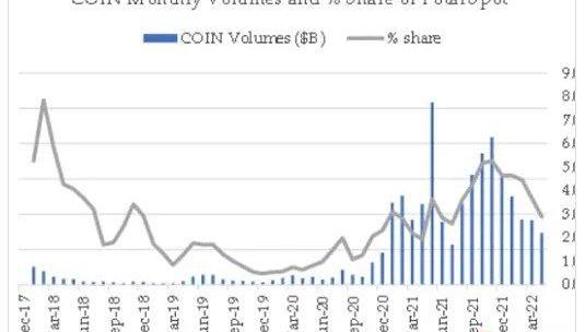 不僅如此,加密現貨交易量的數據表明,Coinbase?在2022年的市場份額也一直在走低。