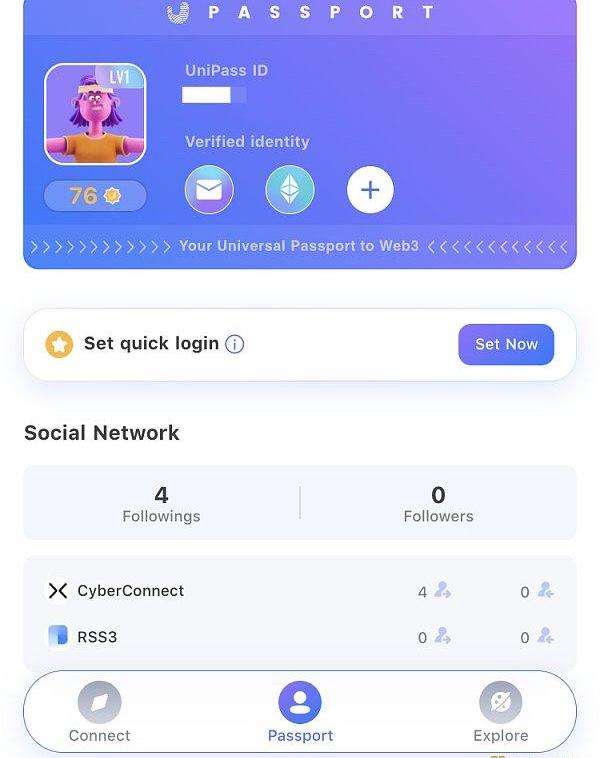 而除此之外的項目,基本都是獨立的第三方產品,借用了CyberConnect的社交關系。較為典型的是Unipass,同時采用了CyberConnect和RSS3的社交關系。在這一場景下,CyberConnect和RSS3都類似一個開放API,供第三方項目讀取用戶的社交關系。相對Lens來說,CyberConnect可能更難建立自己的「族群」生態,但是對于第三方項目的集成來說也更靈活。