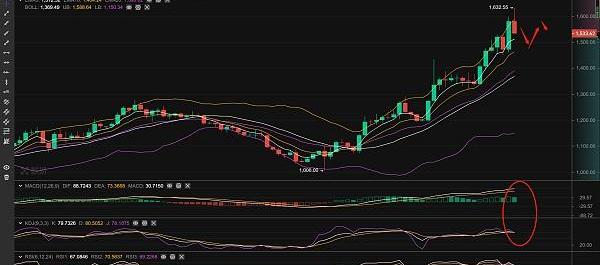 以太坊行情分析:從1小時線來看,布林帶開口向上運行,MACD綠色量柱放量,KDJ和RSI均開口向下,剛剛行情插針1635附近高點回踩,行情有繼續回踩的趨勢,4小時線,布林帶開口向上運行,MACD綠色量柱縮量,KDJ和RSI均拐頭向下,行情早間漲至上軌上方承壓回落,行情有回踩下方支撐再反彈的趨勢,下方可關注1515附近的支撐,上方關注1600附近的壓制。