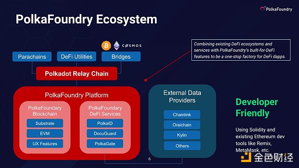 該平臺包括一個公共區塊鏈(PolkaFoundry區塊鏈)以及一些dapp開發人員支持服務,包括身份服務(PolkaID),文檔存儲服務(DocuGuard)和Oracle服務。