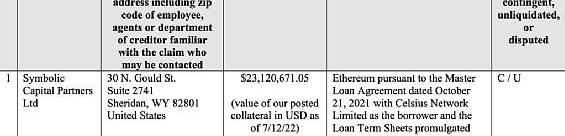 另外該公司還將風險投資公司SymbolicCapitalPartners列為其最大的有擔保債務人,稱其擁有約2000枚ETH,在提交文件時價值約2300萬美元,由該公司作為抵押品持有。