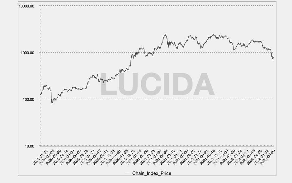 為了更方便地觀察公鏈賽道整體情況,我們將公鏈指數價格制成了圖表,并將坐標軸改成了對數坐標軸。