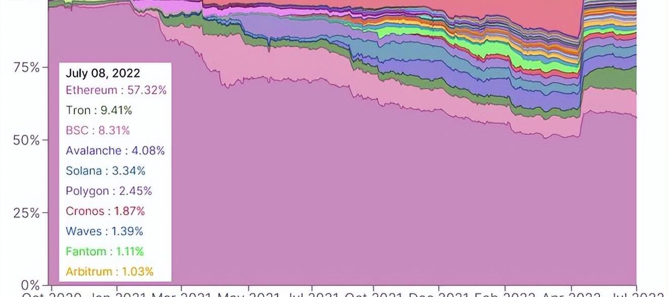 根據DefiLlama的數據,以太坊目前擁有TVL57%的市場份額,高于4月8日的51%。盡管取得了這一收益,但與2021年12月的1000億美元相比,目前網絡智能合約上的350億美元存款似乎很小。