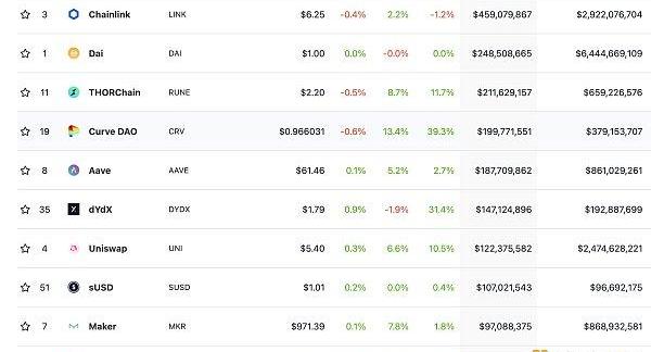 DeFi項目鎖定資產前十排名及鎖倉量數據來源:defillama