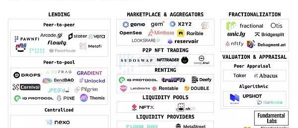 NFT金融化垂直領域包括:NFT市場和聚合器、流動性池、流動性提供者、碎片化、NFT借貸和估值;