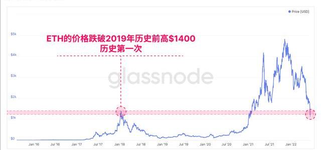 以太坊從其歷史最高的峰值回撤的幅度為-79.5%,將此次拋售置于之前熊市底部的上限內。