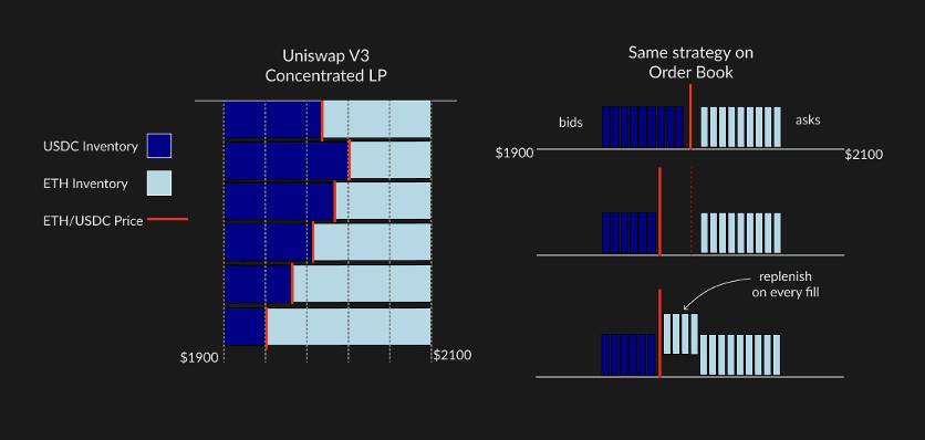 一方面,V3 是 V2 的超集,如果所有 LP 要從 [-∞,∞] 提供流動性,那么您的定價曲線與 V2 相同。另一方面,LP 現在可以以類似限價單的方式在單獨的「桶」中提供流動性。這一升級明顯旨在改善吃單者(taker )的體驗。問題自然就變成了:如果我們已經在犧牲惰性流動性,為什么不建一個訂單簿就夠了呢?