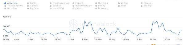 Intheblock數據顯示,自6月12日以來,礦工外流大幅增加,表明他們正在將資金轉移到交易所進行出售。