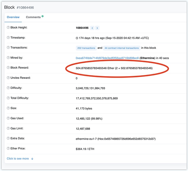 比如,下圖展示了區塊高度為 10864496 的以太坊區塊的情況,該區塊的合計獎勵 (包括交易費 + 2 ETH 的挖礦獎勵) 超過了 504 ETH!