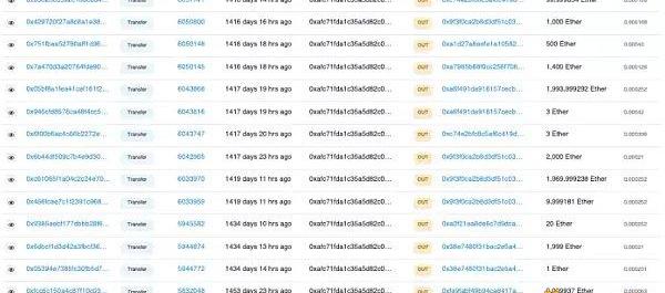 帳號轉移了4,980ETH、1997ETH、1,400ETH、500ETH、103ETH。其中,有2,000ETH?被發送到czhang.eth,20ETH被分配到一個EOA錢包。