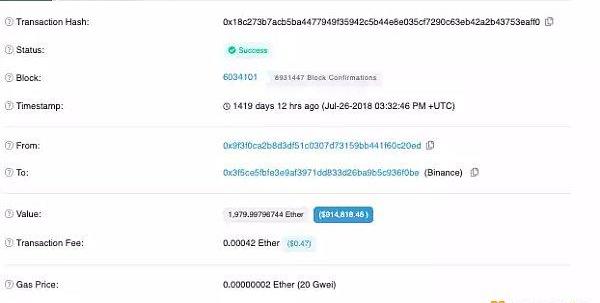 2018年6月29日,謝國梁將10,500ETH轉移到Binance帳號。Binance