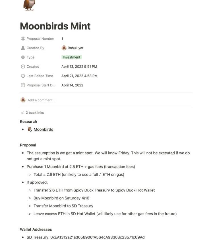 盡管這造成了稀釋,但我最初還是選擇了權衡取舍,因為它可以幫助我們進一步發展。我們的第一筆投資是2.5個ETH的Moonbirdmint。你可以想象這對我們來說是多么激動人心,這讓DAO變得多么誘人?。