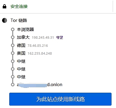 可以發現,在連接的中繼回路的第一個IP地址總是相同的。這是Tor的正常操作。連接的中繼回路中的第一個節點通常被稱為“入口節點/路由器”。它是一個快速且穩定的節點,并且將會在我們的中繼回路中維持兩到三個月,用來抵擋破解匿名攻擊。其余的中繼會在我們每次訪問新網站時改變,這些中繼會一起提供完整的隱私保護。