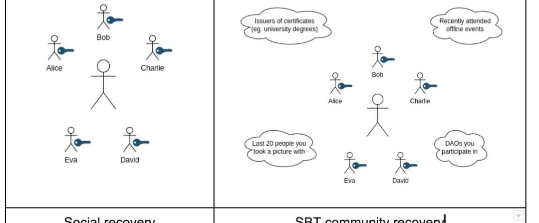 SBT的不可轉讓性——例如一次性頒發的教育證書——提出了一個重要的問題:你如何才能不遺失你的“靈魂”?如今的恢復方法,如多重簽名恢復或助記詞,在心理負荷、處理的便捷性和安全性方面有不同的權衡。社會恢復(socialrecovery)是一種新興的選擇,它依賴于一個人的信任關系。SBT允許一個類似的、但更廣泛的范式:社區恢復(communityrecovery),其中的“靈魂”是其社交網絡的交叉投票。