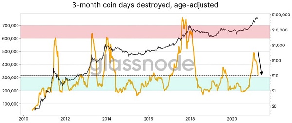 Glassnode首席技術官Rafael Schultze-Kraft也剛剛在推特上發布了一張名為“Coin Days Destroyed”的圖表,以了解長期持有者的行為。這個指標顯示了持有者賣出比特幣所重置的總天數: