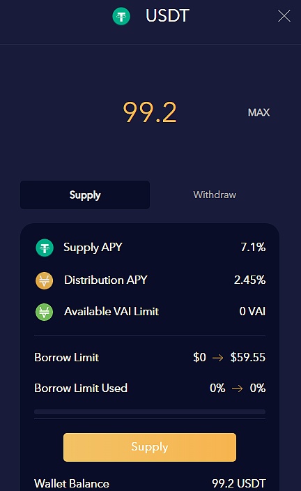 成功后可在Supply 存款 界面看到存款情況,同時可以獲得相應的vUSDT(vToken),作為Venus存款憑證;