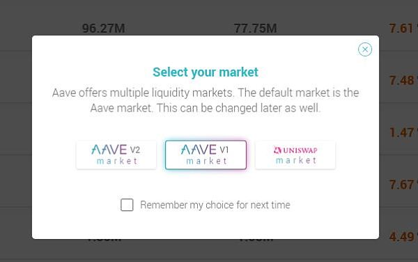 成功連接錢包后選擇 Aave V1(注意是V1)市場;