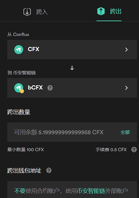 3、以CFX為例,Conflux跨出代幣選擇CFX,相對應的會顯示到BSC的對應bCFX,輸入跨出CFX數量,在跨出錢包地址處填寫幣安智能鏈BSC錢包地址(請注意不要使用中心化交易所提供的充值地址),然后點擊跨出;
