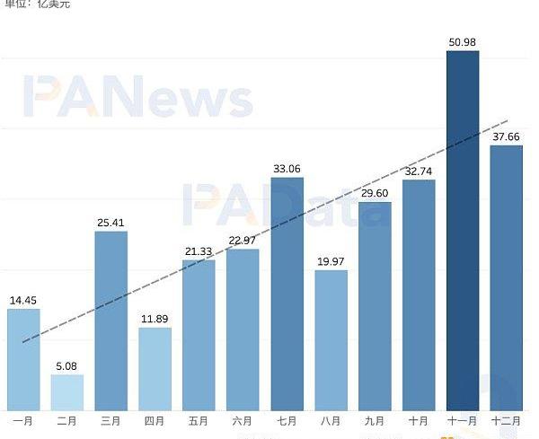 2)全年披露的融資總額為305.1億美元,總體上,投融資總額隨著時間的推移而增長,至11月達到年內峰值,約為50.98億美元。
