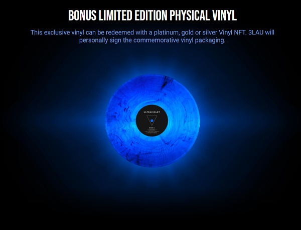 “燒掉實體原版,NFT版賣出4倍價格”的故事確實很動聽,但對于通過NFT大發橫財的創作者來說,“實體版”的價值,似乎并不能一概而論。前文提到的浩室音樂人賈斯汀·大衛·布勞(3LAU),在NFT專輯賣出1160萬美元之后,那些給區塊鏈數字音樂買單的樂迷,可以得到一份特別的藏品——一張3LAU簽名的實體彩膠唱片。