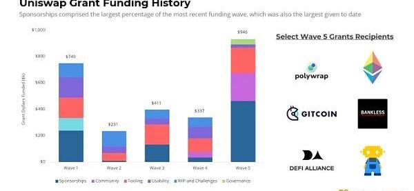 Uniswap贈款計劃(UGP)分批贈款,與任何特定季度或預先設定的時間長度無關。可追溯到2021年3月的五次捐贈的數據已公開,而第六次捐贈已經完成但尚未發布。UGP目前正在進行第七波贈款。請注意,在Wave5中資助的幾筆贈款發生在2021年第三季度。