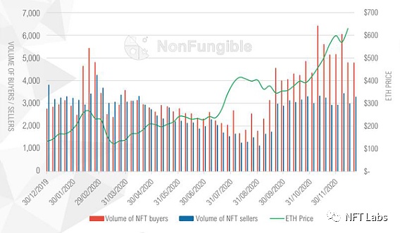 2020?年最后一個季度,隨著以太幣價值的恢復和網絡成本的同步下降,NFT 買家/賣家數量顯著增加。很難將此激增單獨歸因于這兩個因素中的某一個因素。