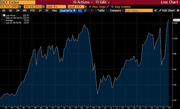 這是代表美國主要商業銀行的KBW銀行指數的走勢圖。如你所見,在2007年達到頂峰后,最近才超越了那個ATH。美聯儲為了拯救 "大到不能倒 "的銀行不惜一切代價,這些銀行還是用了14年的時間才奪回2007年的高點。
