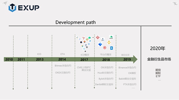 2018年后,大量交易所在經歷現貨市場廝殺后,發力方向開始轉向衍生品市場,從2018年下半年開始,大部分有自我研發能力的交易所都上線了期貨合約交易,主要以永續合約、交割合約、期權合約為主。到了2019年,區塊鏈金融衍生品市場呈現“井噴式”的態勢,有了ChainUP等技術服務商的技術補充,布局合約交易業務的交易所越來越多。同樣,早些年傳統行業芝加哥商品交易所 CME 和芝加哥期權交易所 CBOE 等就布局了區塊鏈金融衍生品,19年,Bakkt也持有相關牌照開通了期貨合約業務。