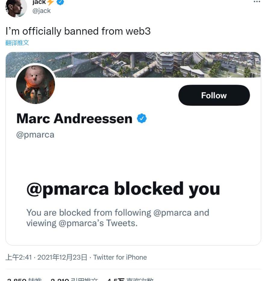 Dorsey在自己的推特上寫下了這樣一句話。此時,a16z創始人MarcAndreessen已將Dorsey推特賬號拉黑。推特核心技術負責人NickCaldwell發文表示,MarcAndreessen同樣也拉黑了自己。
