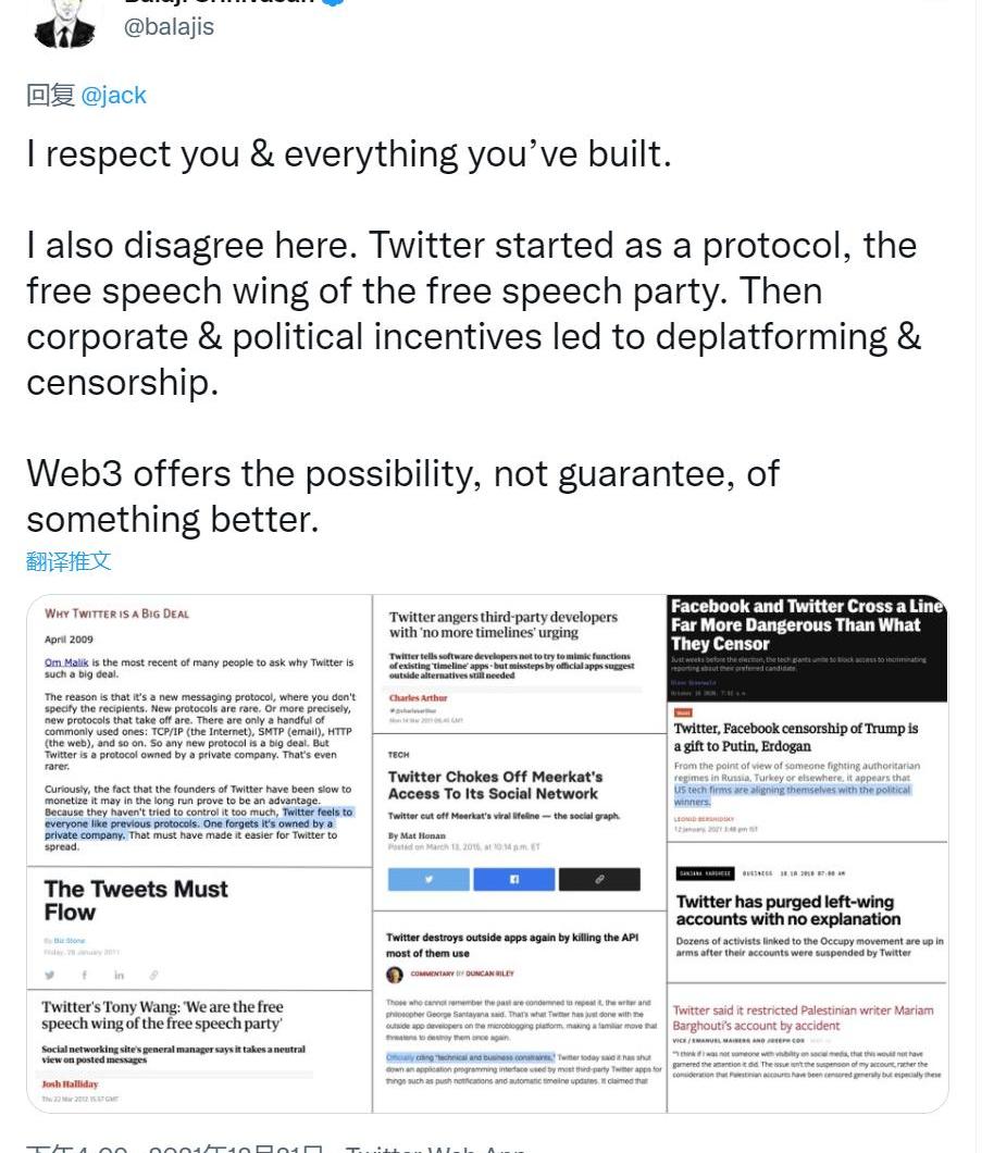 這場口水仗也從Web3.0向兩人所建立的事業蔓延,Srinivasan在反駁的同時仍不忘對推特拋出指責。他認為推特放棄了自己高尚的理想,屈從于「企業和激勵」。而這一點已經破壞了推特的根基——自由主義。