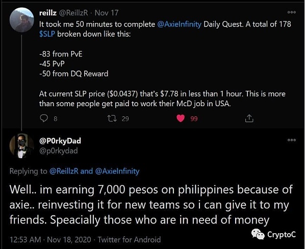Axie Infinity提供了一個清晰的區別于現有游戲的“邊玩邊賺”(play to earn,P2E)生態,現有游戲中的打金操作可能只是P2E的模糊近似,當然,P2E與這些模式并不沖突。新冠疫情期間,這個游戲在菲律賓爆火。事實上,玩這個游戲讓許多家庭獲得的收入超過了他們從一份真實工作中獲得的收入。這些技術吸引人的一個方面是讓我們認識到:虛擬游戲世界有能力做到在全球范圍建立一個經濟自洽的游戲場所(the economic playing field)。