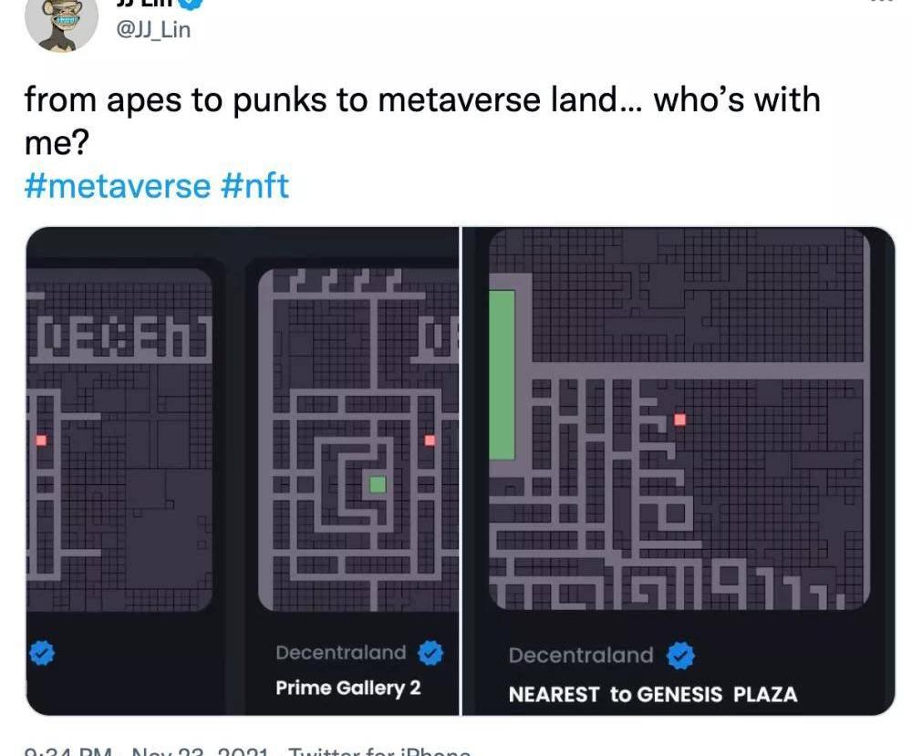 11月23日,林俊杰在推特上宣布已購買Decentraland的三個虛擬地塊,共花費約12.3萬美元,正式踏入元宇宙世界。DCL成立于2017年,是首個建立在區塊鏈和加密貨幣基礎上的元宇宙社區,共發行了9萬塊土地,創建了A城、龍城、龍王國等社區。