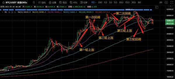 第一輪大漲大致為1月28日-2月21日;第一次回調時間大致為2月22日-2月28日;第二輪上漲為3月1日-3月13日;第二輪回調時間為3月14日-3月25日;第三輪上漲時間為3月26日-4月13日,第三輪回調時間為4月14日-4月25日。