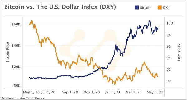 美元和比特幣。在整個2020年,比特幣和美元在很大程度上是背道而馳的。美元指數(DXY)跟蹤美元與一籃子外幣的關系。疫情引發的經濟危機和隨后的貨幣刺激措施導致DXY暴跌,而比特幣卻飆升至歷史新高。然而,隨著經濟復蘇帶來縮減刺激措施的可能性,該指數最近顯示出了復蘇的跡象。如果這一趨勢是比特幣價格走勢的任何指標,那么DXY在2021年的上漲可能預示著加密貨幣的虧損。然而,隨著疫情在美國接近尾聲,隨著市場為疫情后的經濟重新調整,可能會看到金融趨勢的震蕩。因此,只有時間才能告訴DXY-BTC相關性是否仍然是一個相關指標。