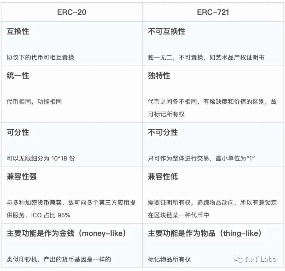 FT 和 NFT 的一大區別在于使用了不同的合約接口,前者為 ERC-20,后者為 ERC-721。