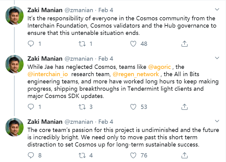 在此前,Manian一直在推進Cosmos系統內重要的IBC協議的開發工作。Manian在2月4日曾表示,即使他離開,也會推進IBC開發的工作。