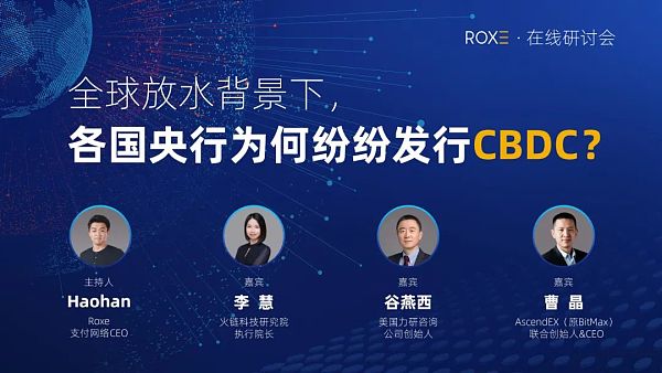 目前,巴哈馬、烏拉圭、厄瓜多爾、委內瑞拉、泰國、柬埔寨已發行CBDC,中國等新興市場國家的央行數字貨幣已進入實際測試階段,CBDC在全球的發展已經進入快車道,CBDC的發展與落地會對央行帶來什么影響,能否有效應對通貨膨脹,會面臨怎樣的機遇和挑戰?為此,Roxe支付網絡于4月21日,邀請了火鏈科技研究院執行院長李慧、美國力研咨詢公司創始人谷燕西、AscendEX(原BitMax)聯合創始人&CEO曹晶,圍繞CBDC的發展趨勢進行了深入探討,Roxe支付網絡CEO Haohan擔任會議主持人。