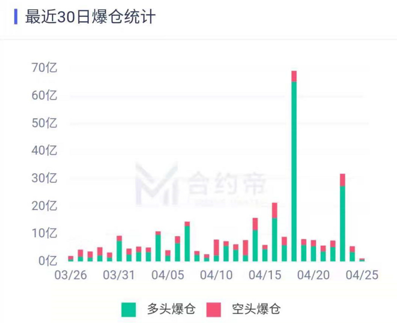 合約帝數據顯示,4月18日,比特幣暴跌超1萬美元,全網合約爆倉金額超69億美元,爆倉賬戶達50萬個之多;4月23日,比特幣再現暴跌模式,全網合約爆倉金額超31億美元。