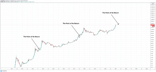 上面的圖表演示了“不歸路點”是什么樣子的,從那時起,以市值計算的領先的加密貨幣比特幣,其價值增加了600%至800%。?