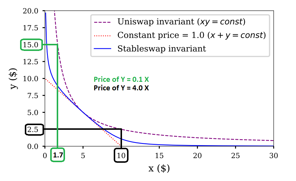 例如,恒定乘積函數 x*y = k 就是規則之一,x 和 y 分別代表代幣 A 和 B 的存量。若想從流動性池中取出一些代幣 A,交易者必須按一定的比例向流動性池中注入代幣 B,以確保 x 和 y 的乘積等于常量 k(交易費另算)2。