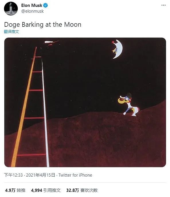 4月15日,馬斯克貼上了1926年西班牙超現實主義畫家胡安·米羅(Joan Miró)的作品Dog Barking at the Moon,發了一條內容為“Doge Barking at the Moon”的神秘推特: