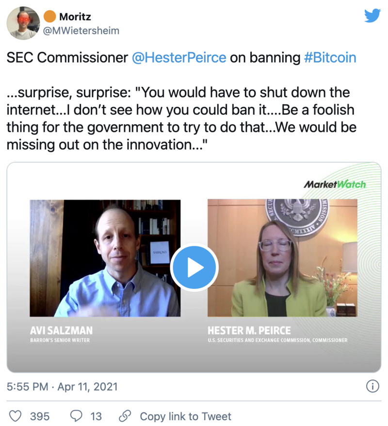 自我調節是像比特幣這樣的分布式開源技術的最重要組成部分。比特幣的供應量預先設定了2100萬個單位的硬性限制,區塊平均每10分鐘被開采一次,礦工會得到新比特幣的獎勵,供應量的增長每4年減半,任何人都可以通過運行一個節點來查看和驗證交易,如果有互聯網接入并遵守共識規則,任何人都不能被審查出網絡。無論你、我或美國監管機構怎么想,這些原則都不會改變。美國政府可以試圖禁止其公民使用網絡,但比特幣將繼續在互聯網上運行。證券交易委員會的Hester Peirce最近提出了這一點,她的結論是:"政府禁止比特幣是愚蠢的"。