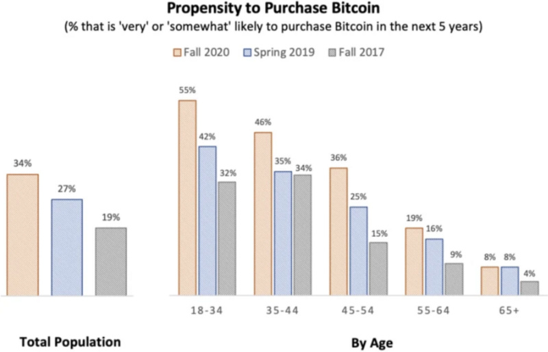 2020年秋季BlockChain Capital的調查顯示,55%的千禧一代可能會在未來5年內購買比特幣,而55-64歲年齡段的人只有19%。千禧一代持有加密貨幣的可能性是他們父母的三倍,因為他們更熟悉新技術,并且對無形資產感到舒服,可能把這種資產視為他們創造更健全的財務未來的機會。隨著時間的推移,這一代人越來越接近權力的席位。至少他們會成為渴望選票的家的考慮對象。